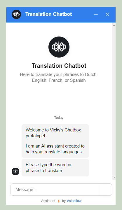 In the Chat window, type a word or phrase to translate, then choose which language you'd like to translate it to! The ChatBot will tell you what language the original word/phrase was written, then provide a translation to the language specified.